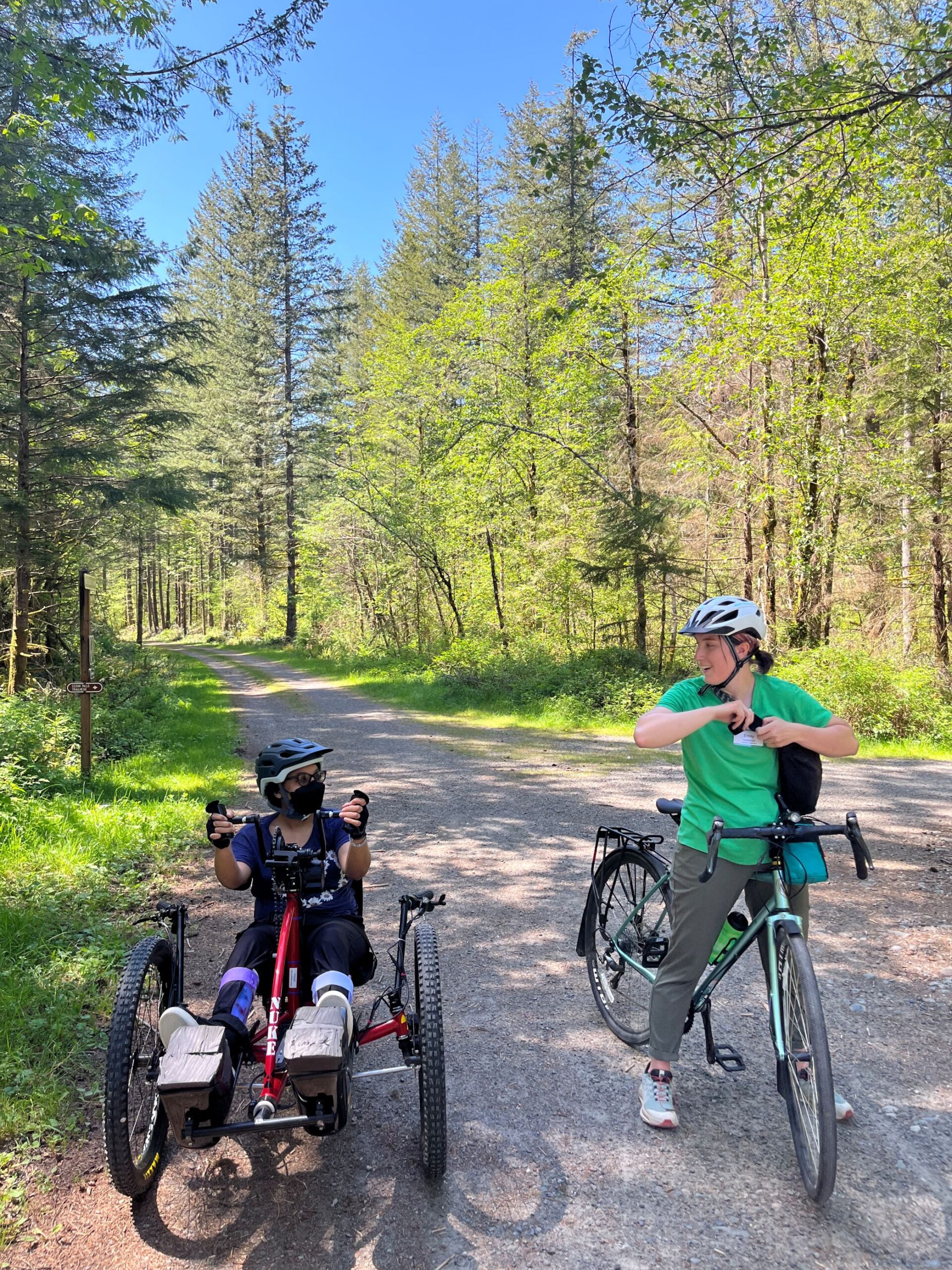 program is geared towards riders ages 18 and up who can independently ride a bike or trike on varied road surfaces including pavement and gravel. Participants must be able to manipulate the brakes and gears and steer a bike independently at a pace of 5-10 miles/hr for a distance of 7-10 miles. Recumbent trikes and handcycles are available if needed, as well as standard two wheeled bikes for those who can already independently ride one. Lessons will be a mix of group riding and 1:1 instruction and will cover basic bike handling skills and trail etiquette, with opportunity to ride progressively longer distances each week.